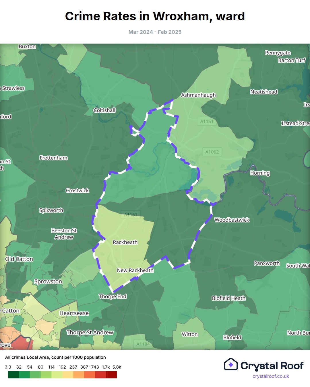 The figures in grey indicate the relative ratings of Wroxham (ward) for a specific crime type compared to other wards in England and Wales.