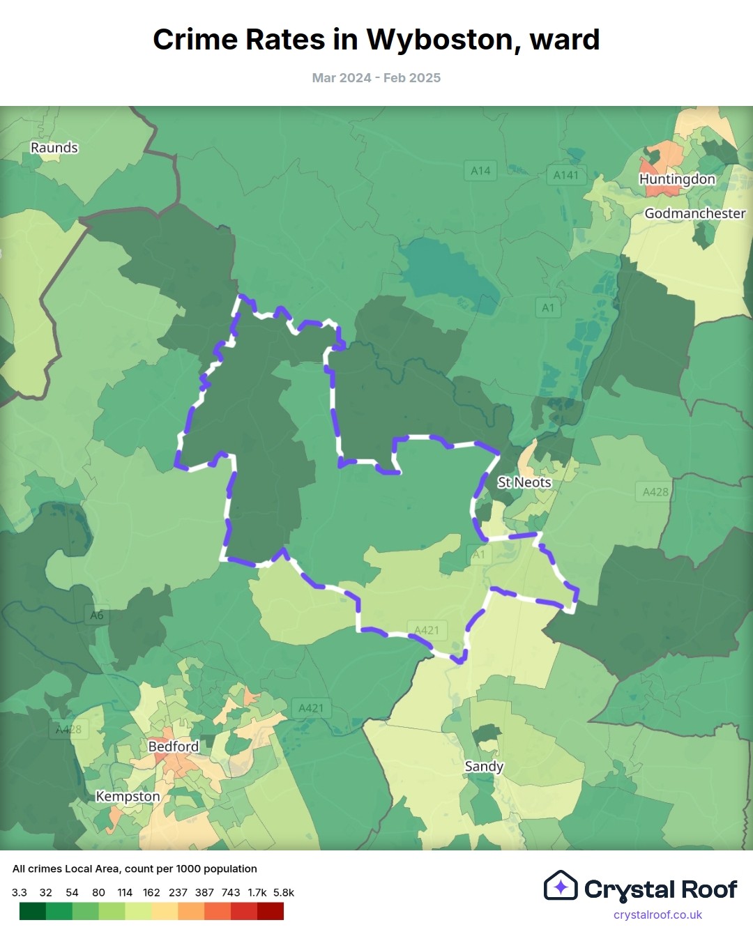 Wyboston, (ward) includes areas with the following crime ratings (see map):