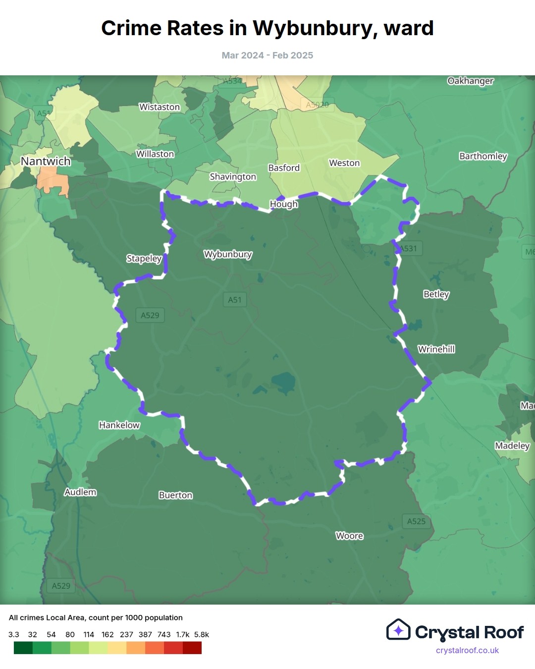 Wybunbury, (ward) includes areas with the following crime ratings (see map):