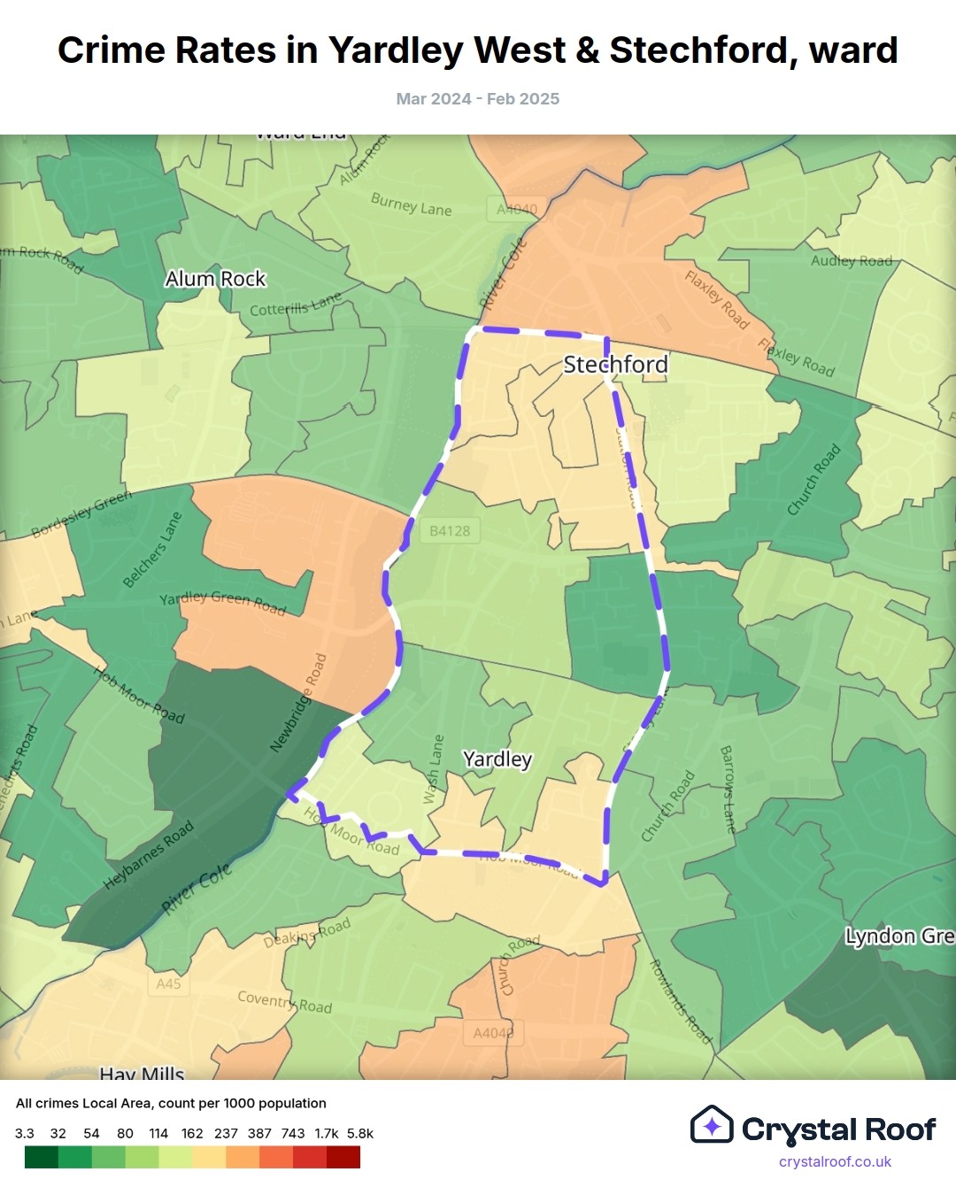 The figures in grey indicate the relative ratings of Yardley West & Stechford (ward) for a specific crime type compared to other wards in England and Wales.