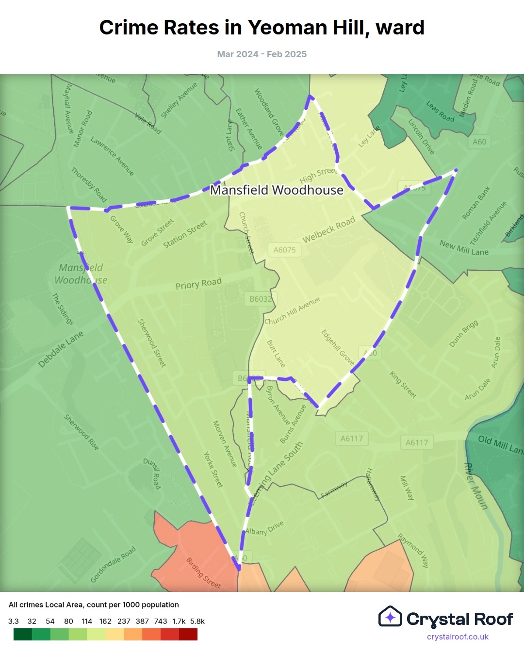 Yeoman Hill (ward) is located within Mansfield (borough). Annual total crime rate in Mansfield (borough) is 114 crimes per thousand resident population, which can be rated as 5 out of 10 or medium crime level compared to other local authority districts in England and Wales.