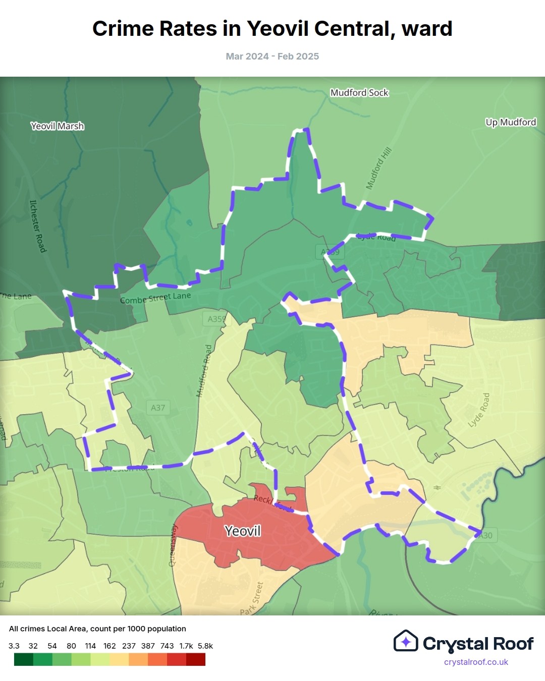 Yeovil Central, (ward) includes areas with the following crime ratings (see map):