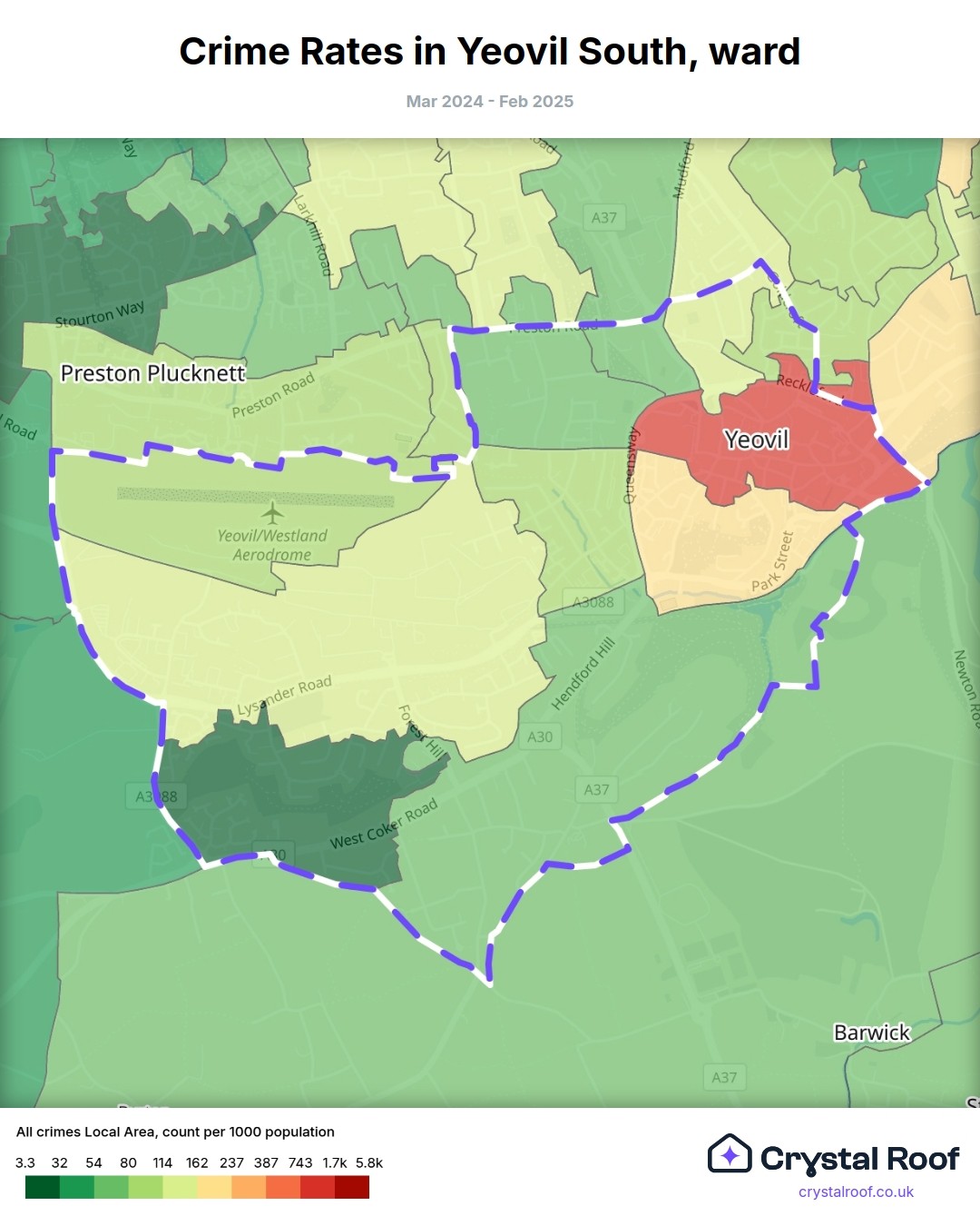 Yeovil South, (ward) includes areas with the following crime ratings (see map):