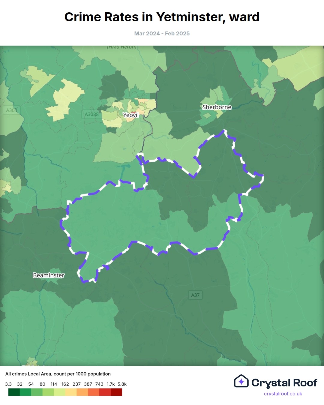 Yetminster, (ward) includes areas with the following crime ratings (see map):
