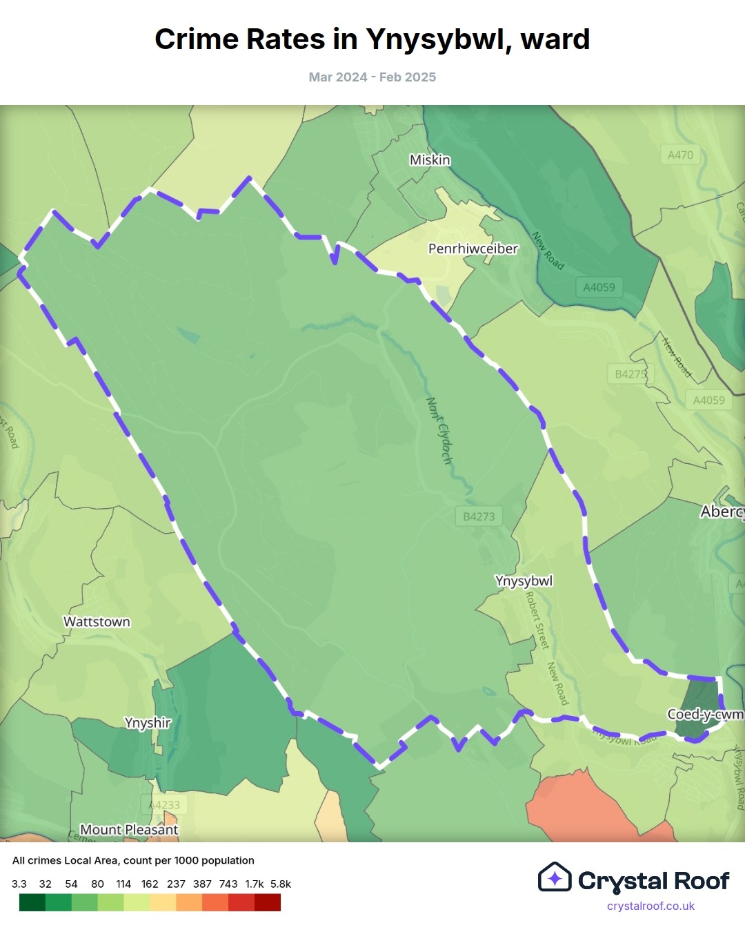 The figures in grey indicate the relative ratings of Ynysybwl (ward) for a specific crime type compared to other wards in England and Wales.