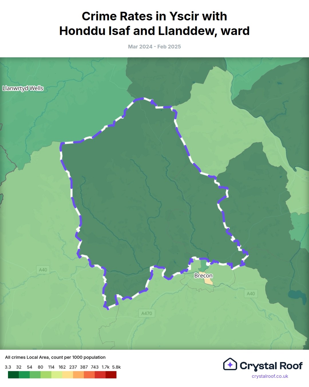 Yscir with Honddu Isaf and Llanddew, (ward) includes areas with the following crime ratings (see map):