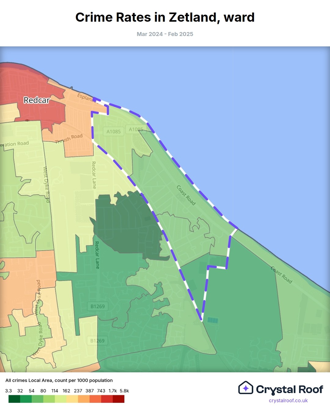 Zetland, (ward) includes areas with the following crime ratings (see map):